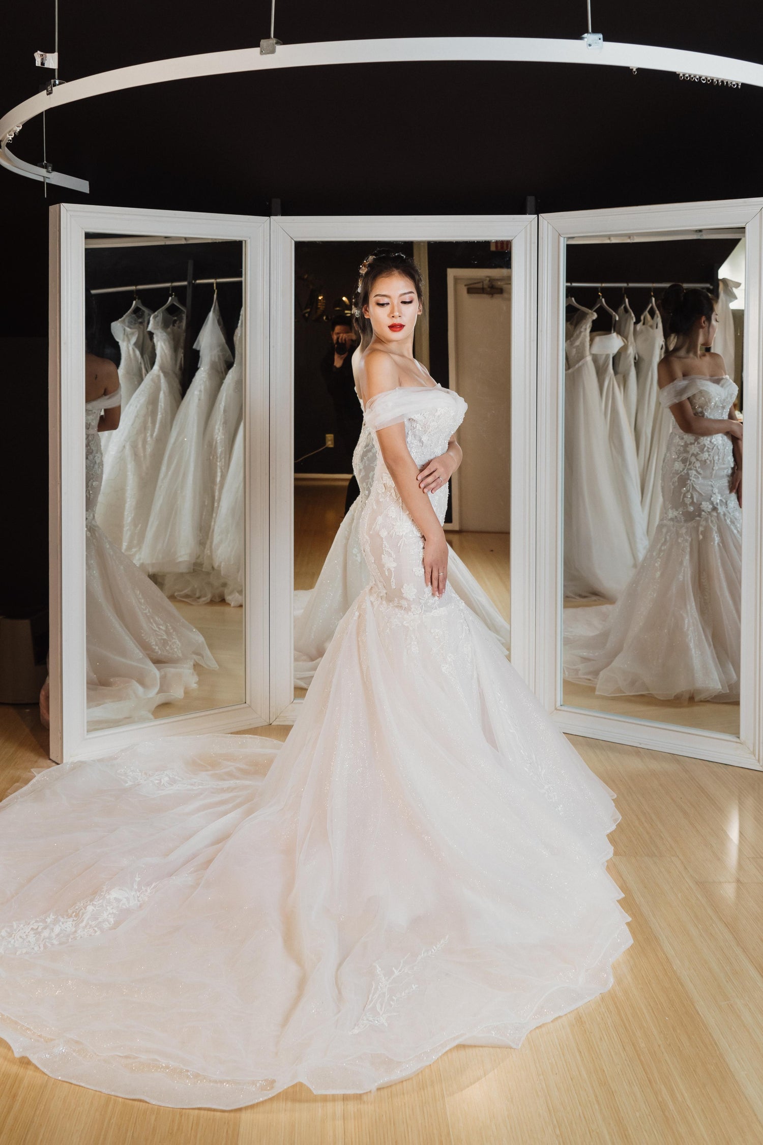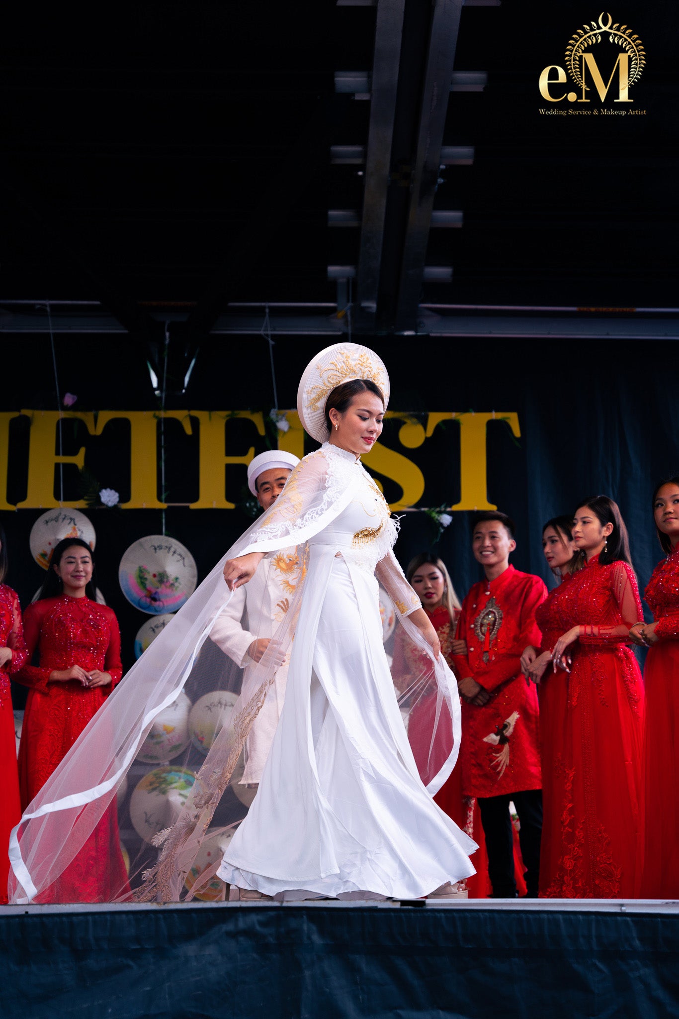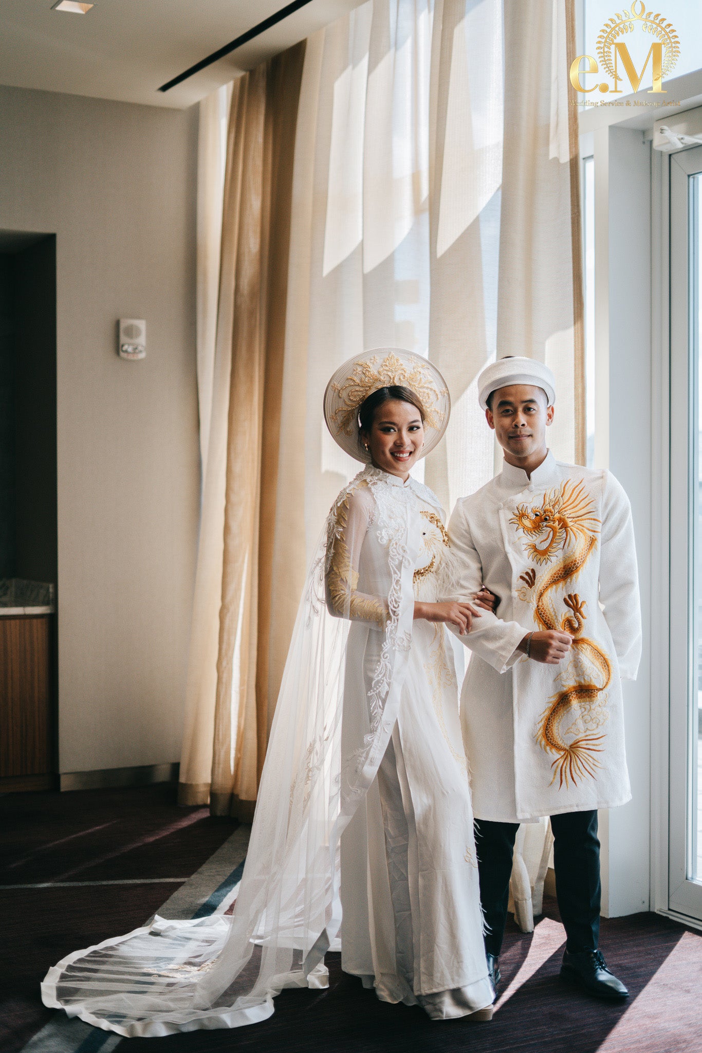 To custom make an ao dai or wedding dress, you will need to contact us via email sales@em-elite.com. During the consultation, you will discuss your preferences and design ideas, and the designer will take your measurements. Once the design is finalized, we will begin work on your dress. A deposit will be required before work begins, and the remaining balance will be due upon completion of the dress.